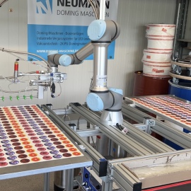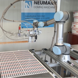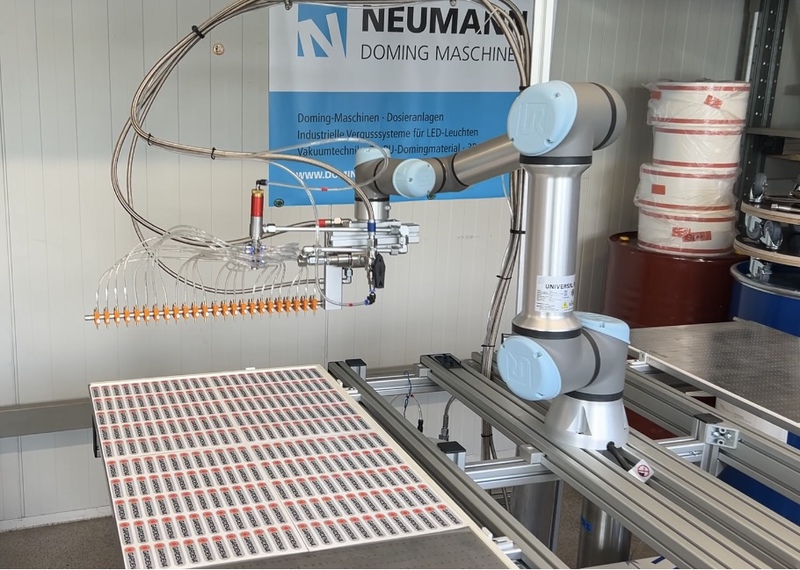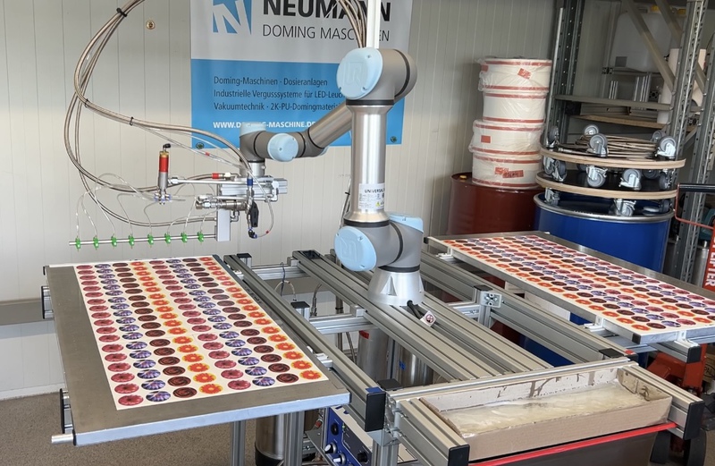 Unsere Doming Roboter sind zugleich für die Produktion mit 2K Polyurethan oder UV Doming Harz geeignet.